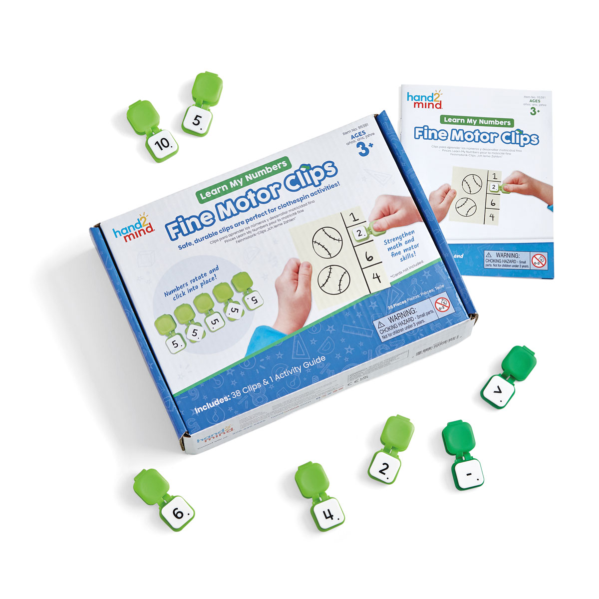 The clips have indentations that intuitively guide little fingers into the pincer grip and help build hand strength. The easy-to-read numbers twist so the clips can be used in any direction.