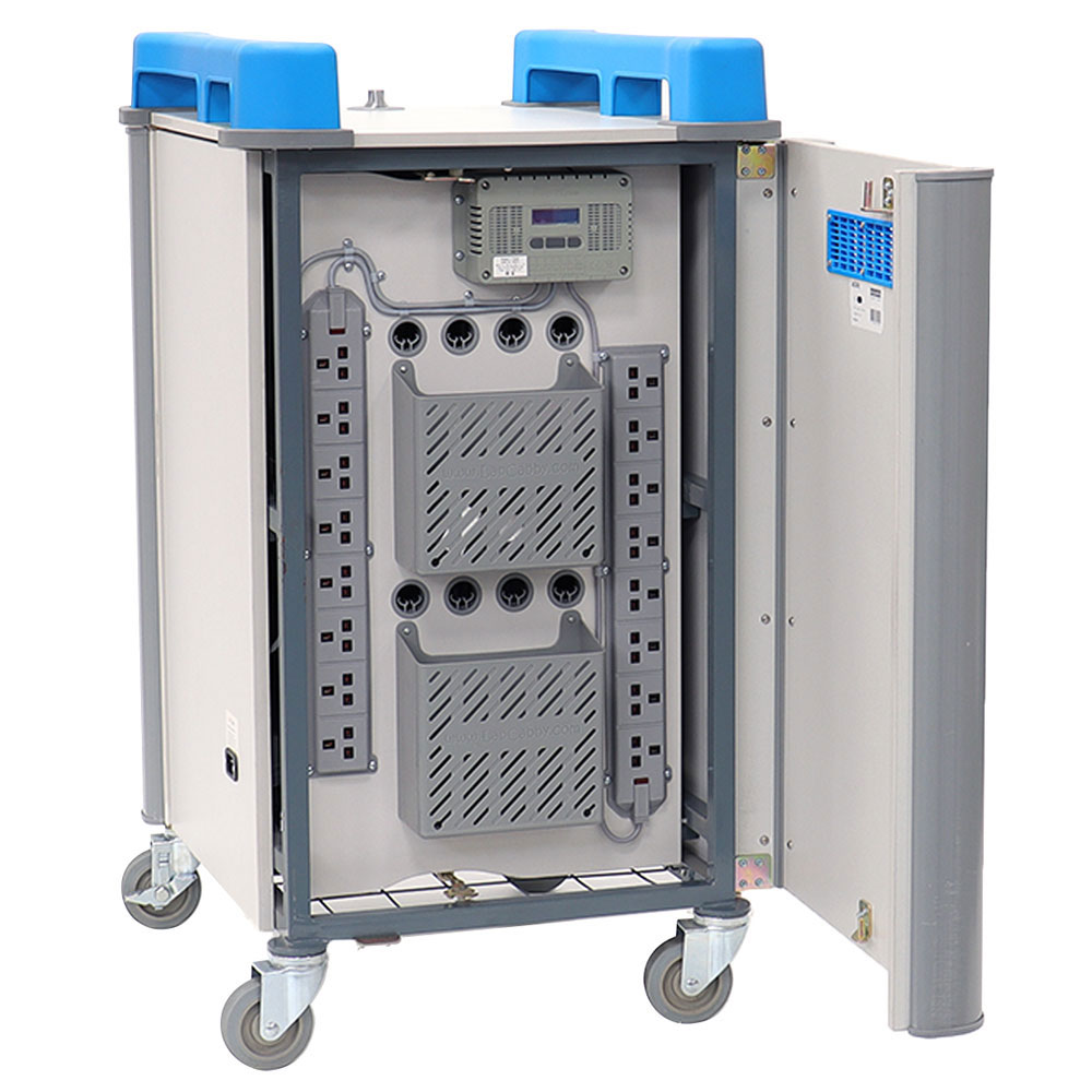 With sliding shelves that store devices vertically with dividers, specially moulded rubber mats keep devices in place while cable management clips protect charging cables.