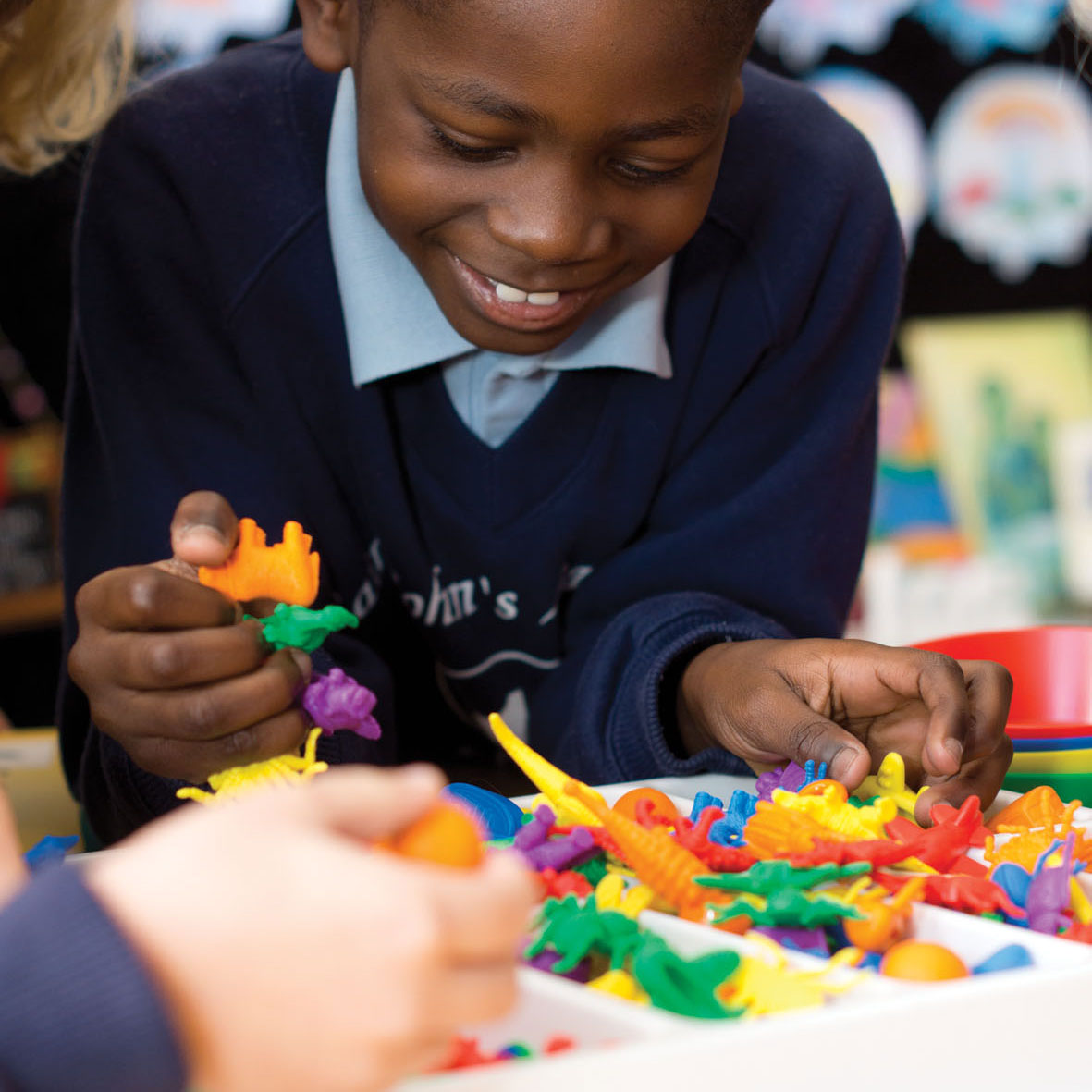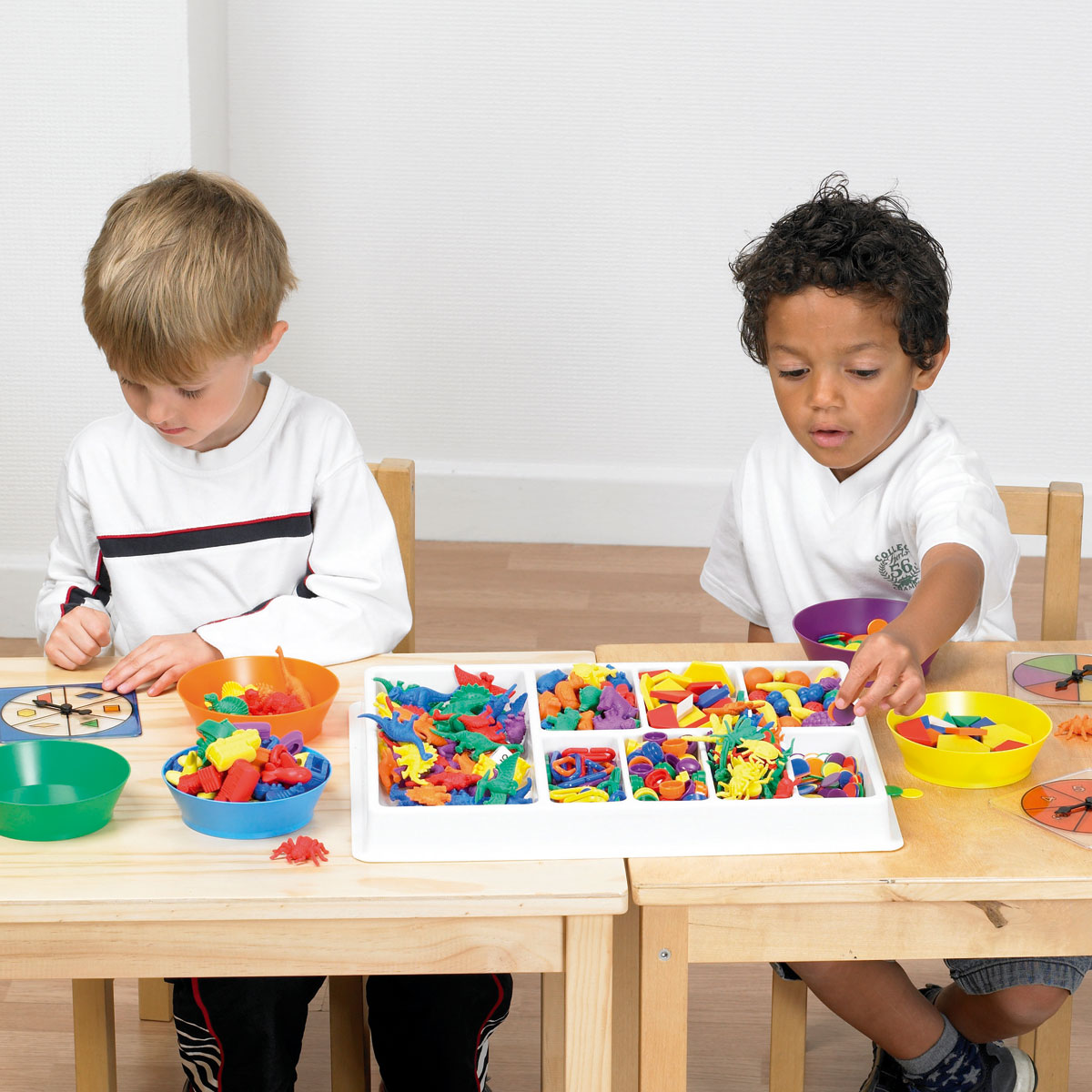 Contents: Large rectangular eight compartment sorting tray, 6 coloured sorting bowls, 36 fruit counters, 36 transport counters, 36 bug counters, 36 farm animal counters, 250 round colour counters, 100 plastic shapes, 102 links, 72 stacking counters, 40 dinosaur counters, 3 spinners & 16mm dice.